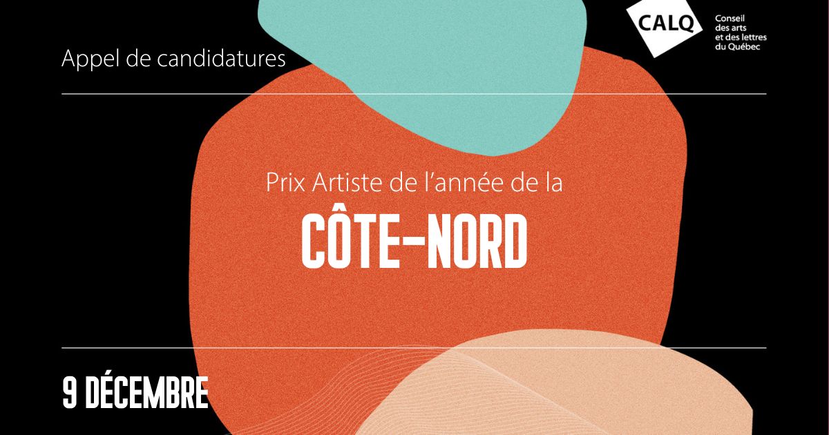 Baie-Comeau, 8 octobre 2025 – Le Conseil des arts et des lettres du Québec (CALQ), en collaboration avec Culture Côte-Nord, lance un appel de candidatures pour le Prix du CALQ – Artiste de l’année Côte-Nord. Les dossiers doivent être déposés auprès du CALQ au plus tard le 9 décembre 2025.