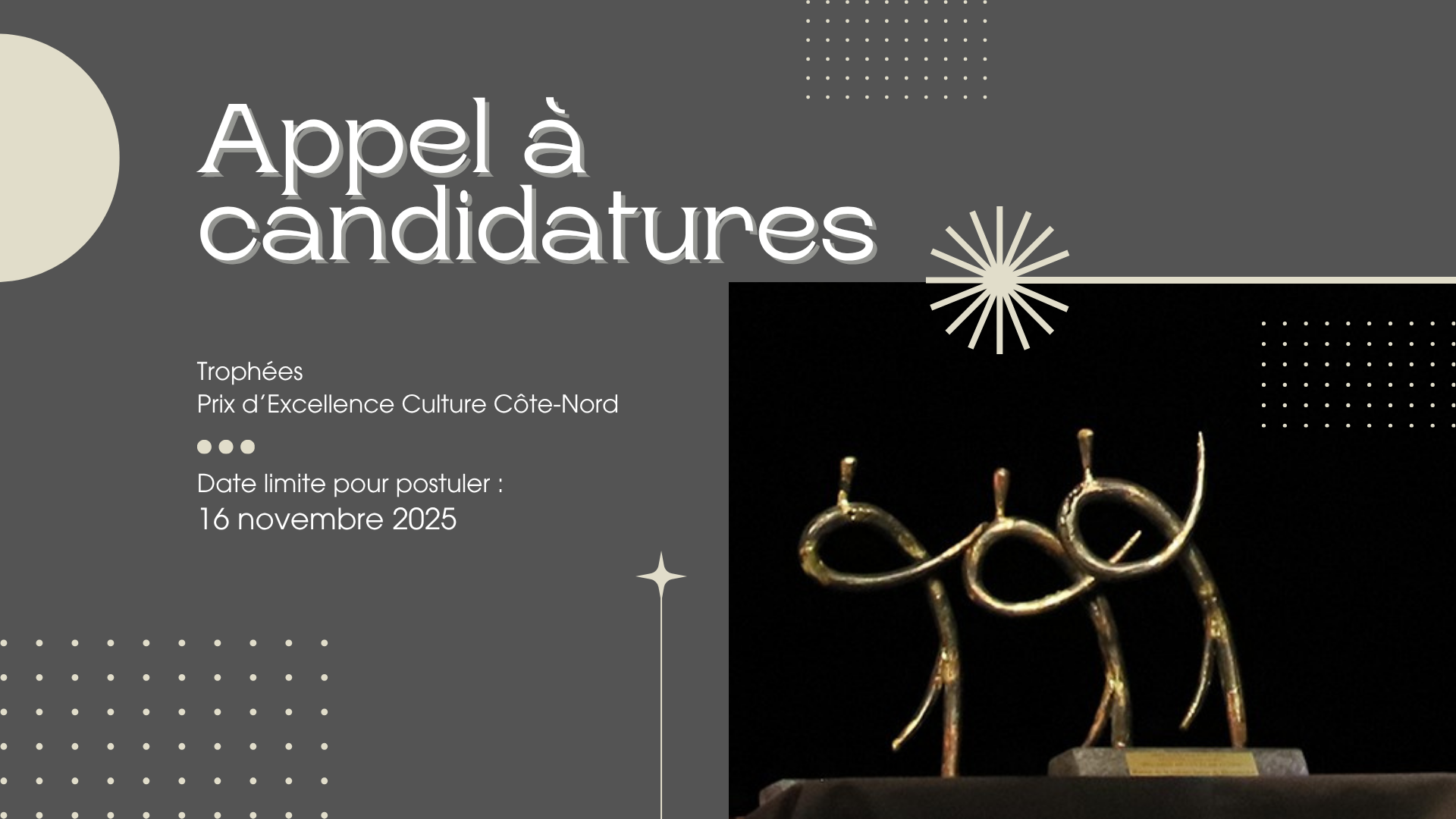 Baie-Comeau, le 7 octobre 2025 – Culture Côte-Nord (CCN) invite les artistes et artisan·e·s professionnel·le·s de la région à concevoir un tout nouveau trophée, qui sera remis lors des trois prochaines éditions des Prix d’Excellence (2026, 2028 et 2030).